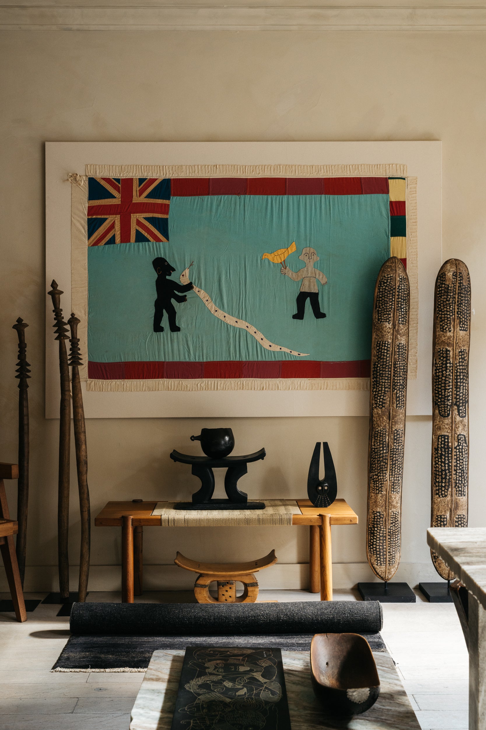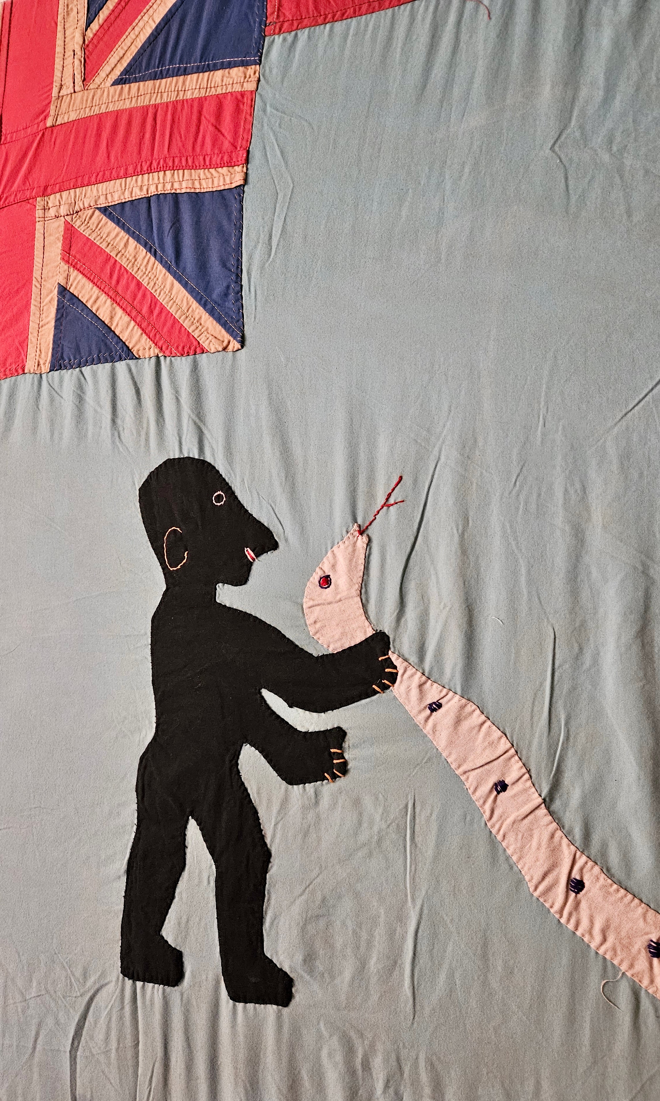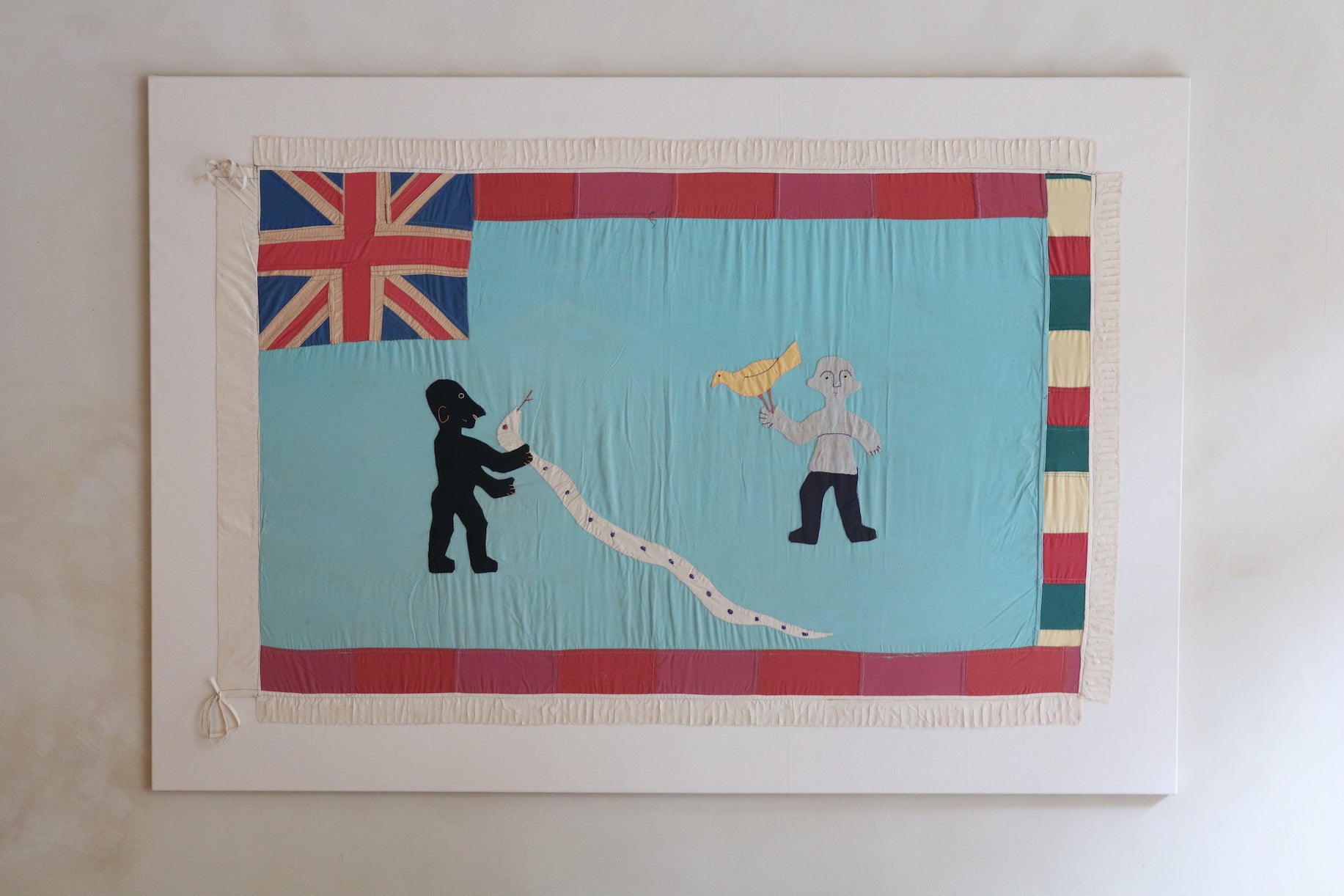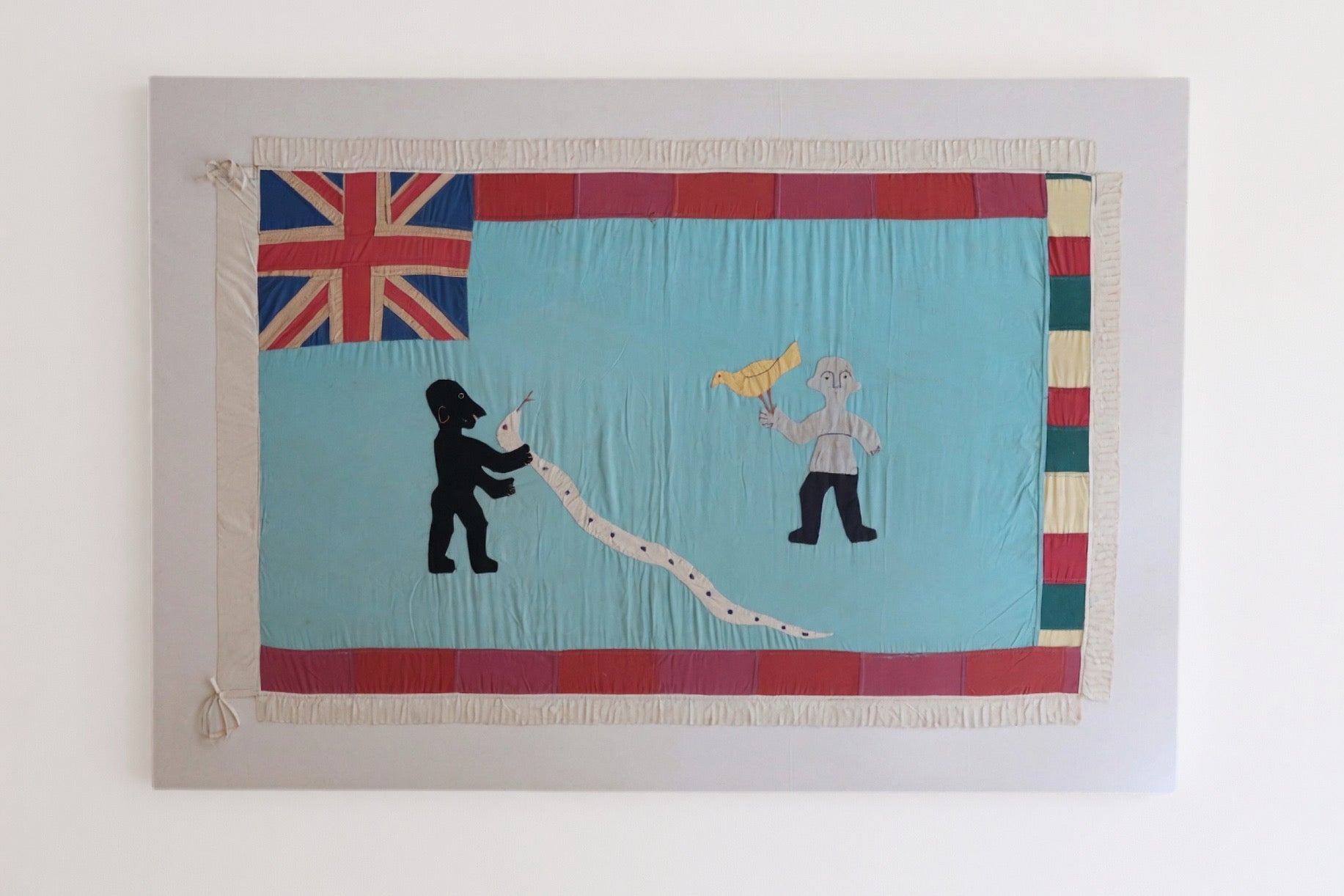 A Fante Asafo flag is a vibrant and symbolic textile from the Fante people of Ghana, traditionally used by Asafo warrior companies. Made from brightly coloured cloth, the flag features bold appliqué designs depicting animals, figures, and scenes that convey proverbs, historical events, or moral messages. Each image is rich with meaning, often reflecting strength, unity, rivalry, or social values within the community. Both dynamic and expressive, a Fante Asafo flag stands as a powerful emblem of identity, heritage, and storytelling.