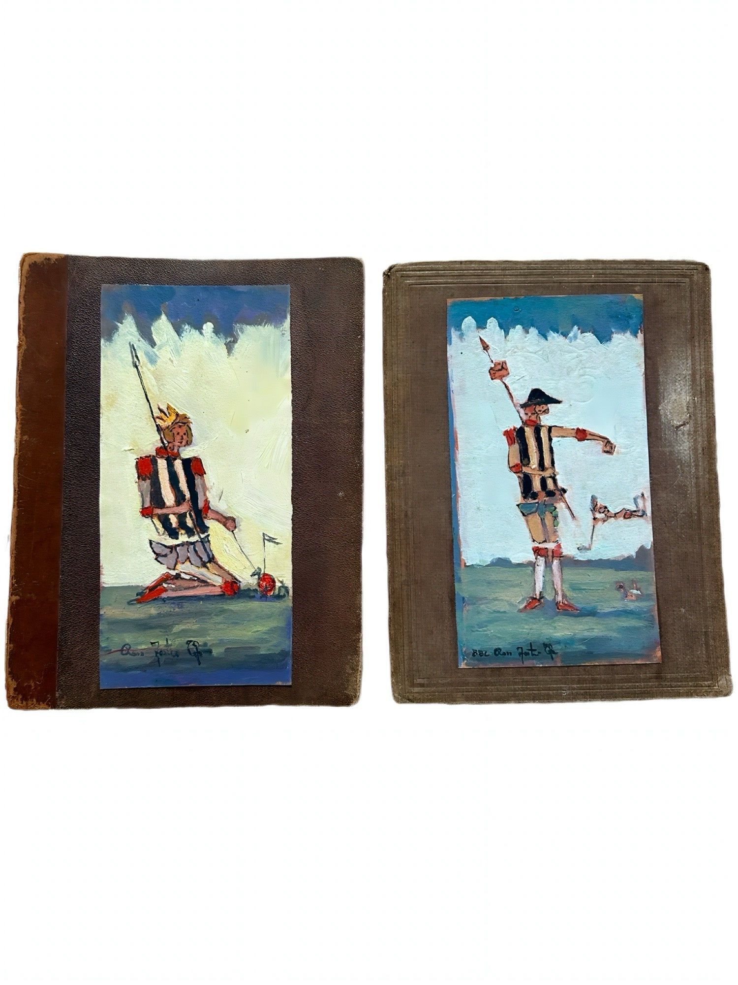 A charming and humorous pair of original oil sketches by British artist Ross Foster, painted directly onto the covers of vintage books. Each piece features a stylised, almost cartoon-like soldier in a bold black-and-white striped uniform, accented with lively red details and playful posture.
