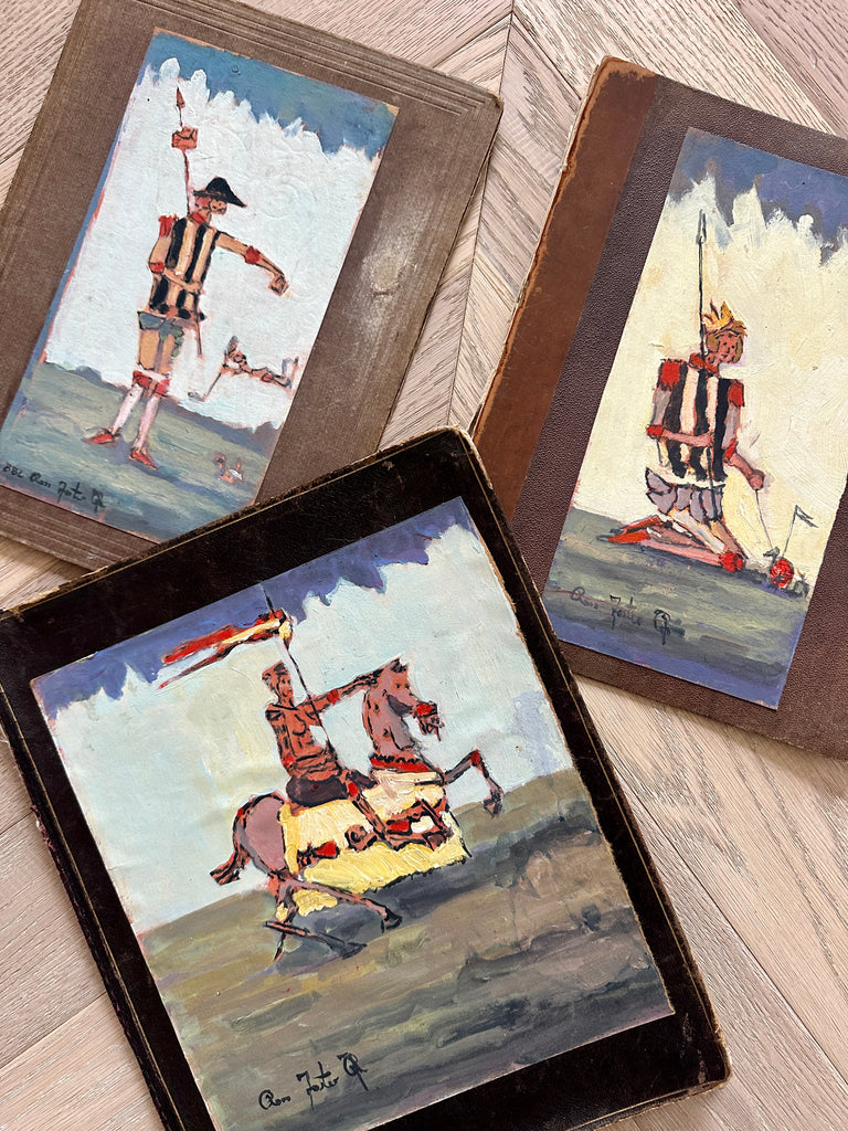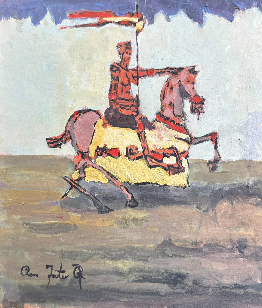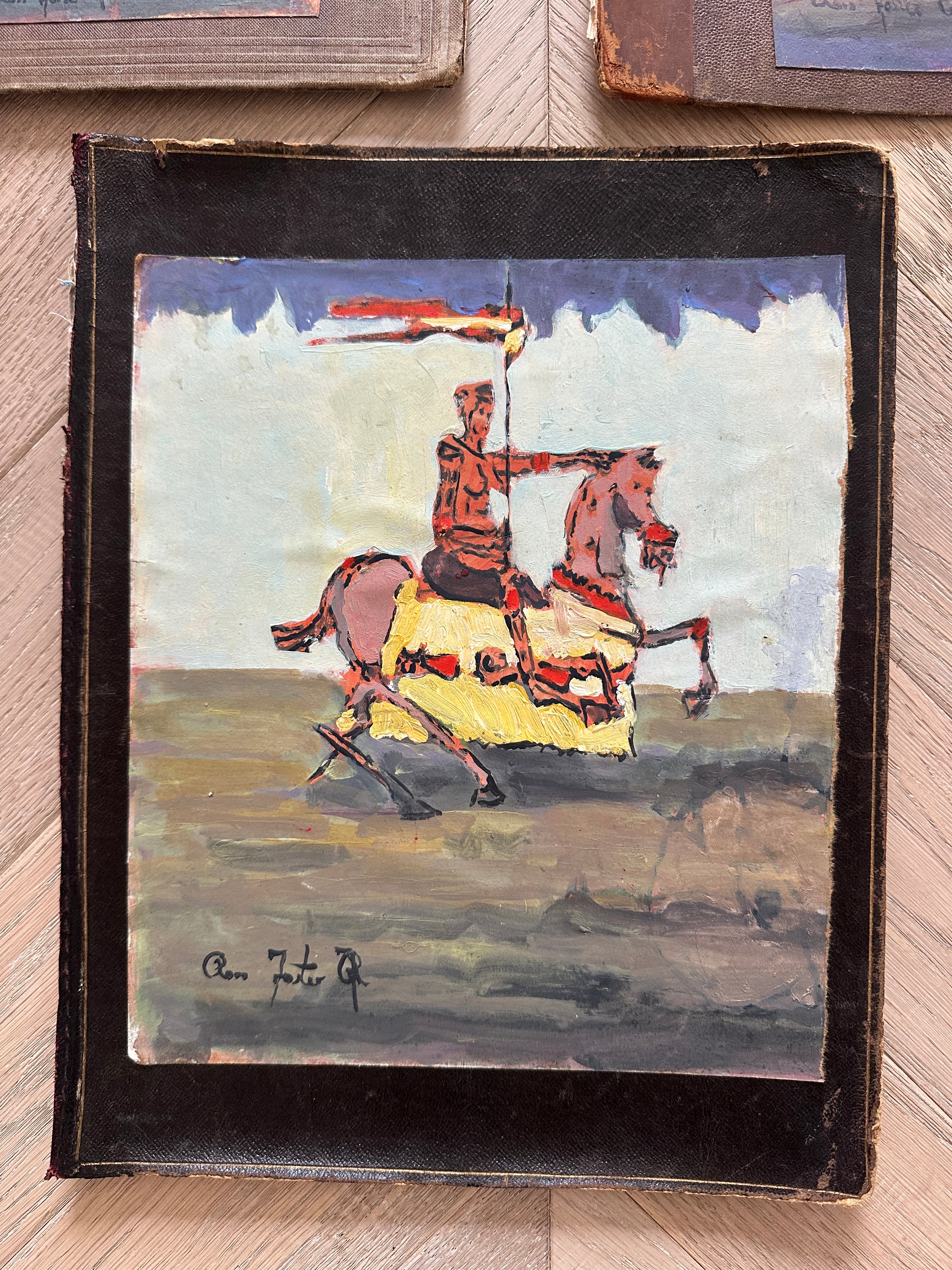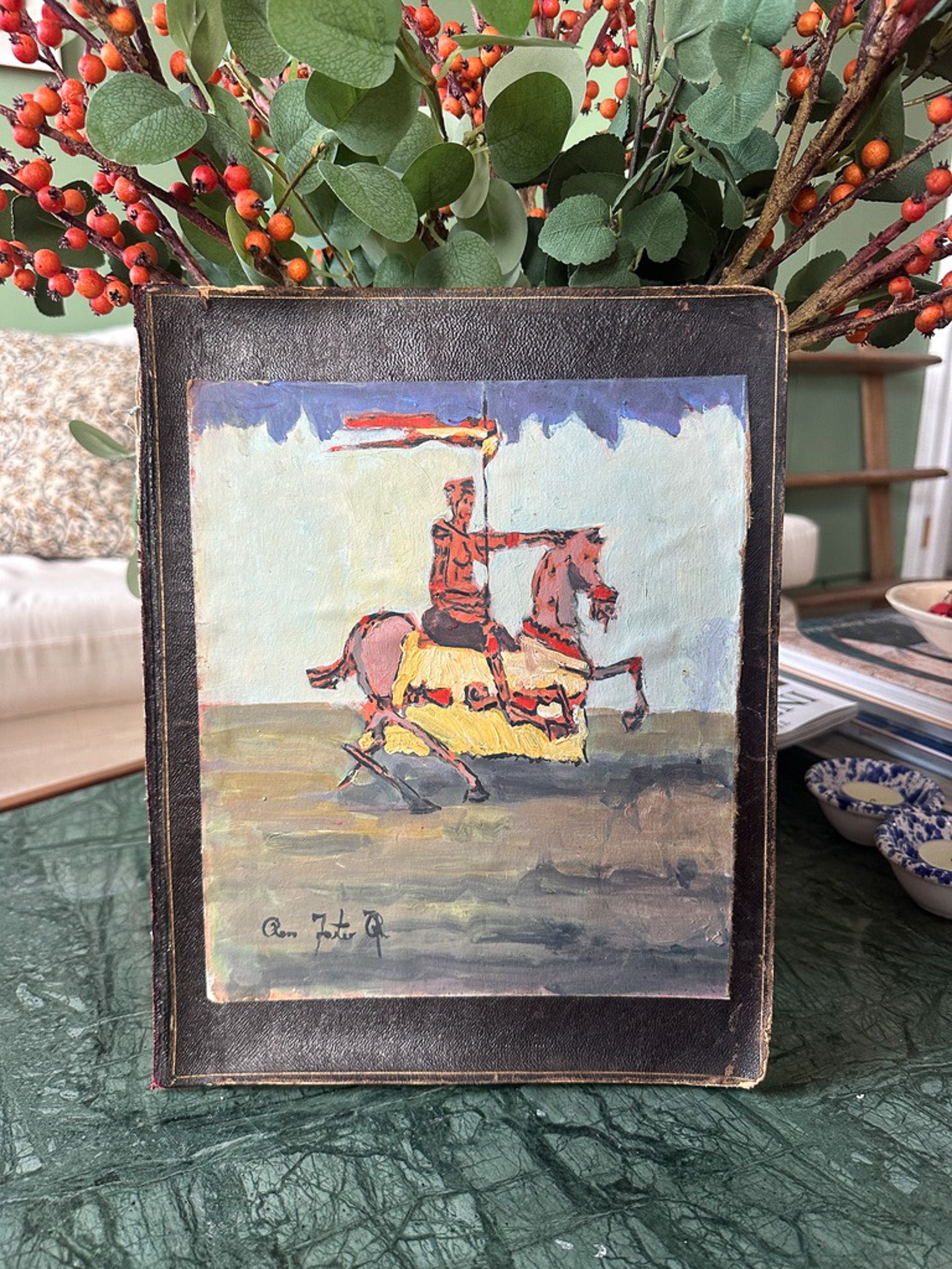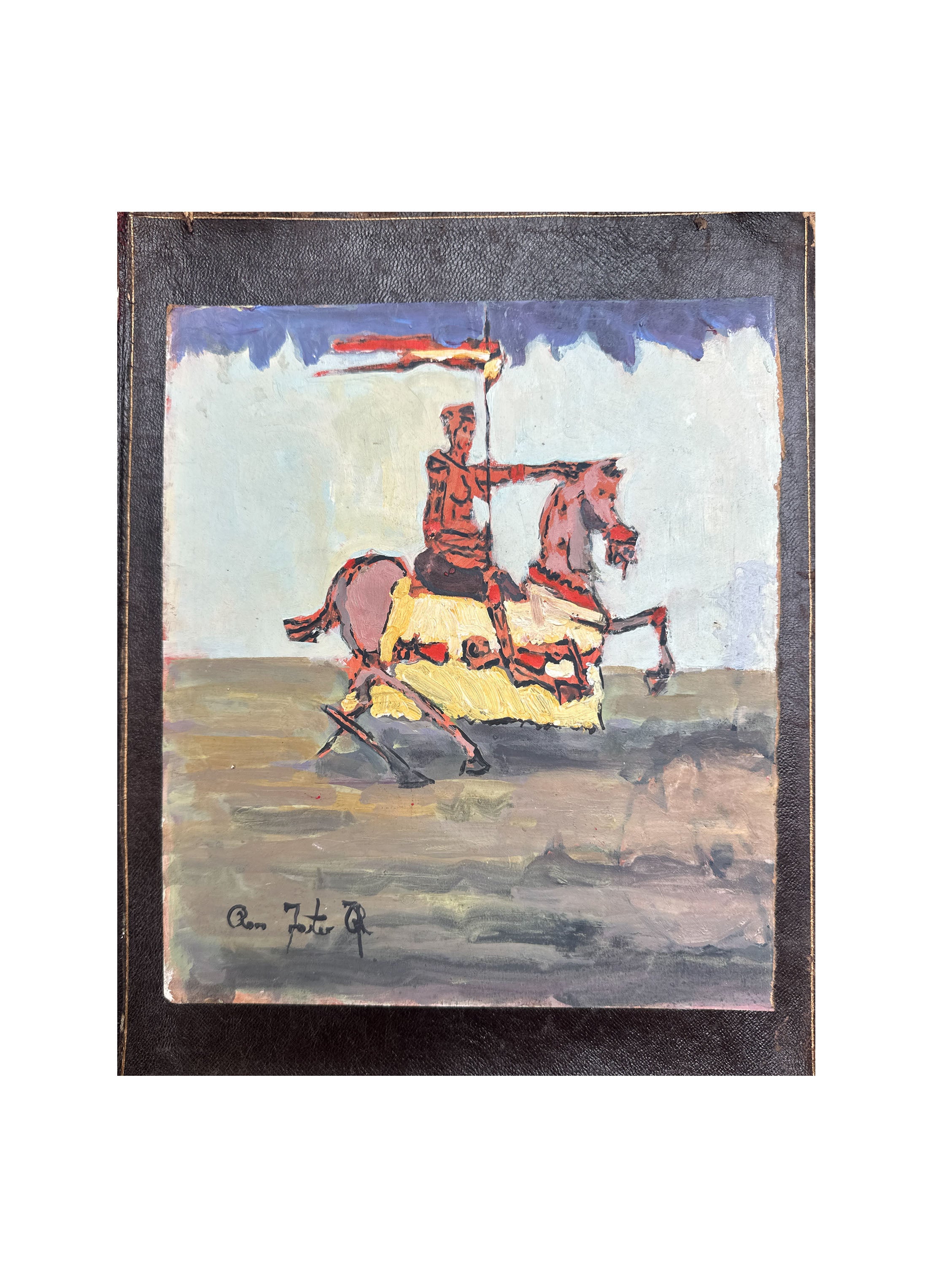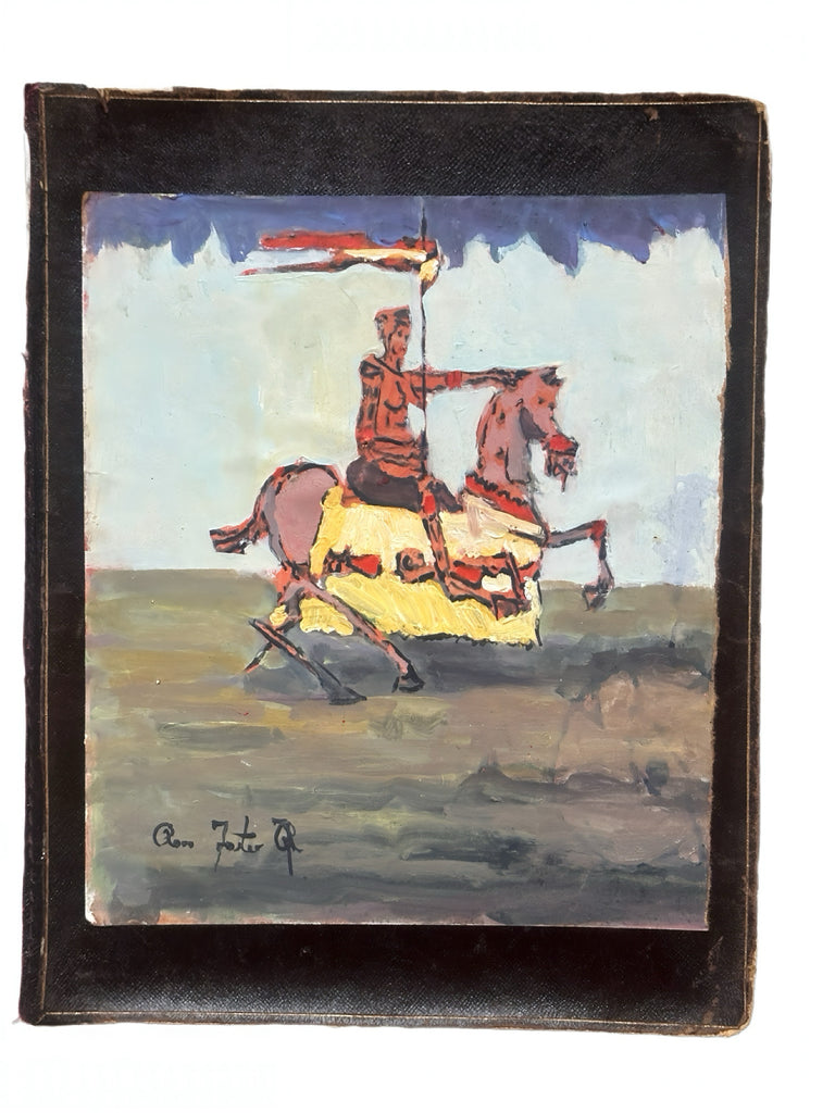 This painting depicts a flag bearer on horseback, charging into battle with vivid energy. Rendered on a book cover, the piece evokes a sense of historical depth and antiquity. Framed in an oversized format, it would amplify the drama and intensity of the scene, making it a striking focal point in any collection.