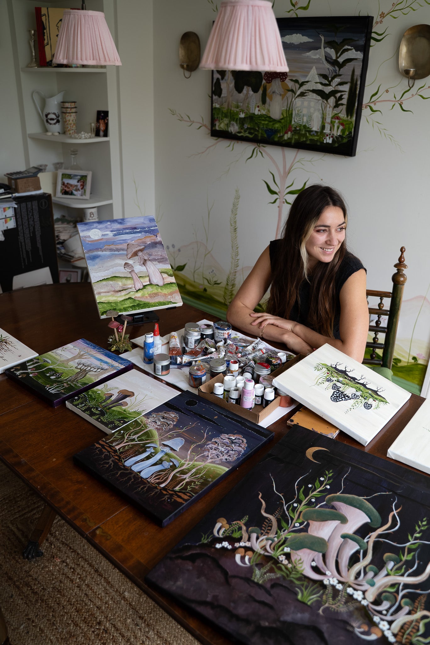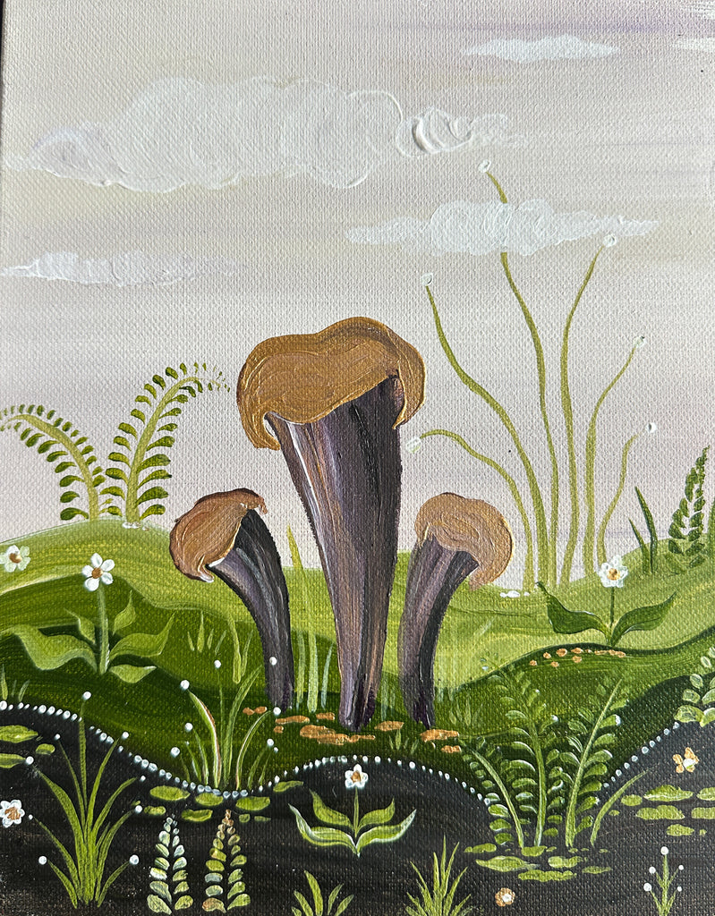 ‘Black Trumpet’ by Bell Hutley, is typically found in decaying organic matter, yet Bell gives this mushroom new life by placing it on a thriving forest floor, surrounded by the vibrancy of living nature. The Black Trumpet’s uneven, distinctive form is captured beautifully, with three mushrooms depicted from varying perspectives. With its dark namesake, this mushroom perfectly aligns with Bell’s signature theme, of darkly romantic art.
