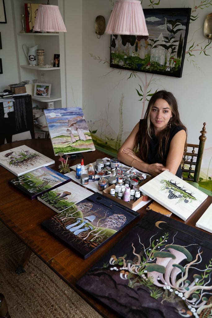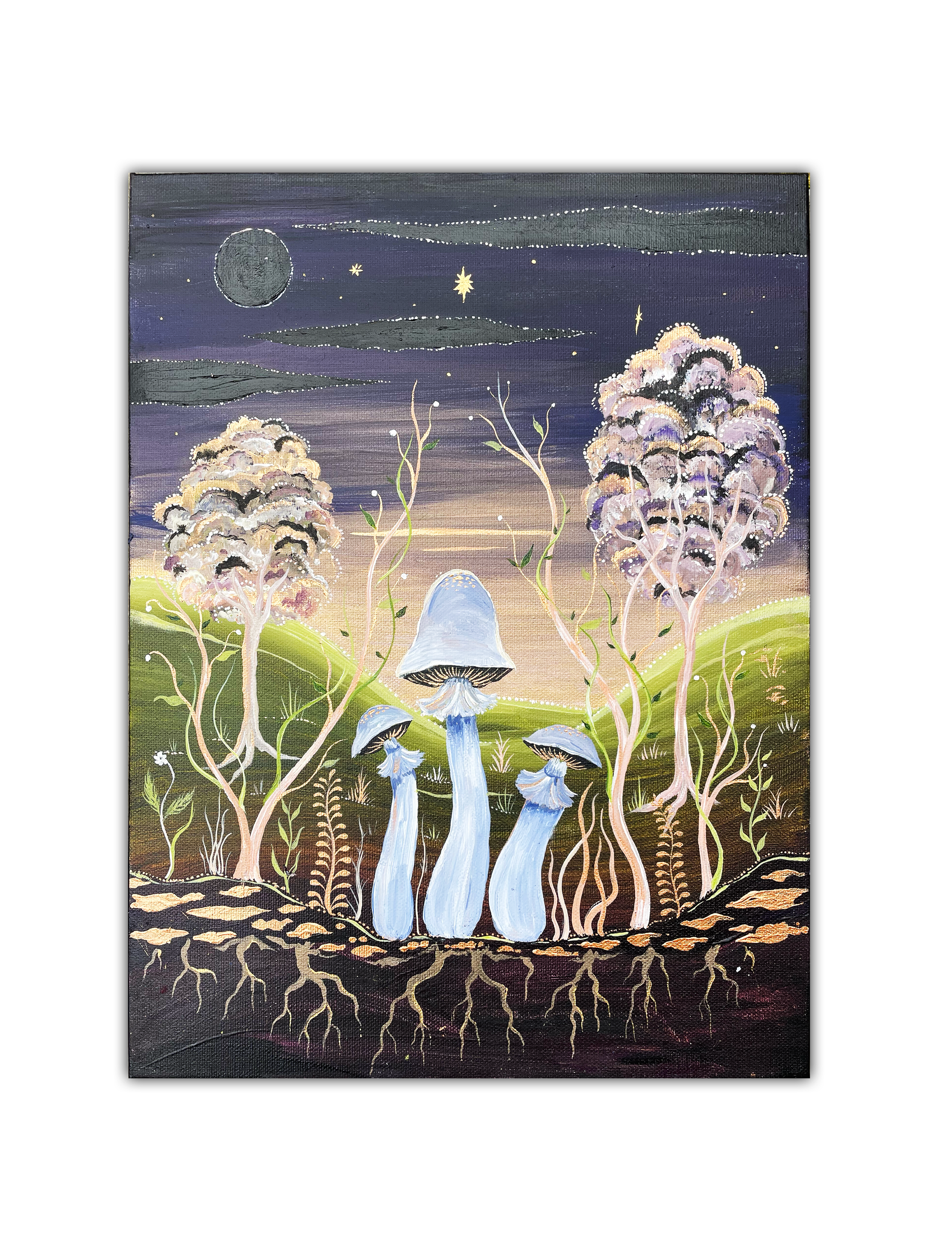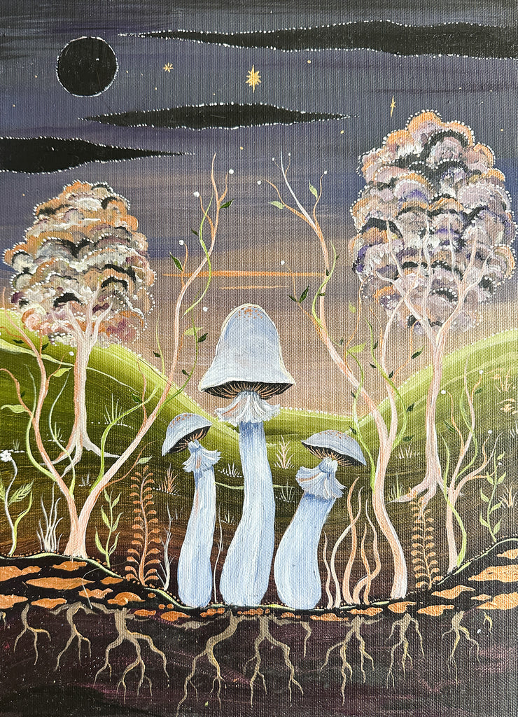 ‘Blue Round Head by Night’ by Bell Hutley depicts three tall mushrooms, grand in their stature, gazing upward into the night sky. They rest within a gentle valley, embraced by the surrounding trees, as moonlight spills softly over them from above.