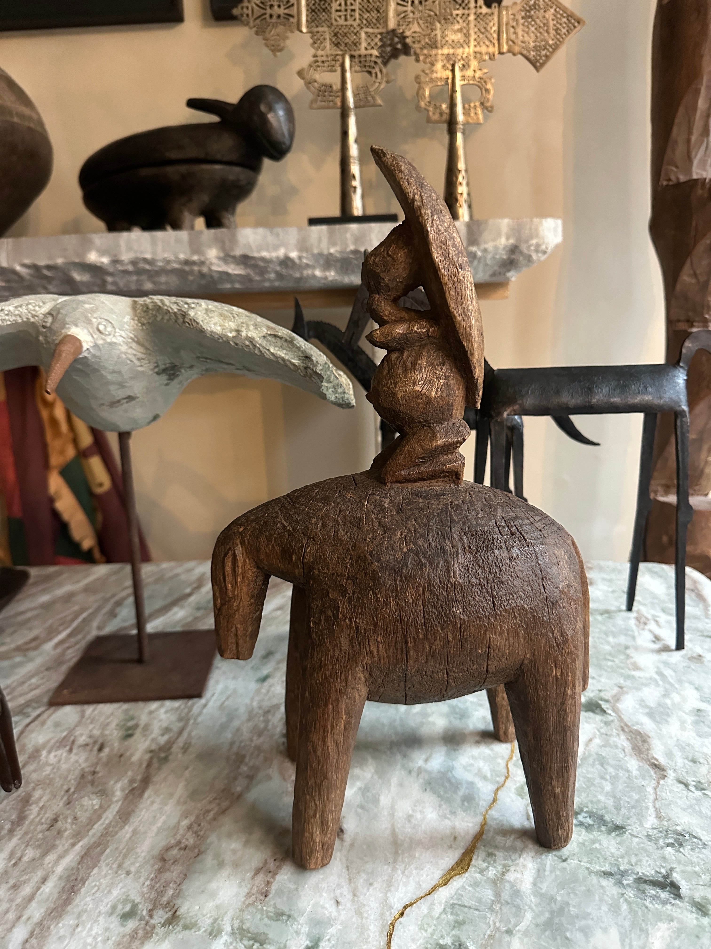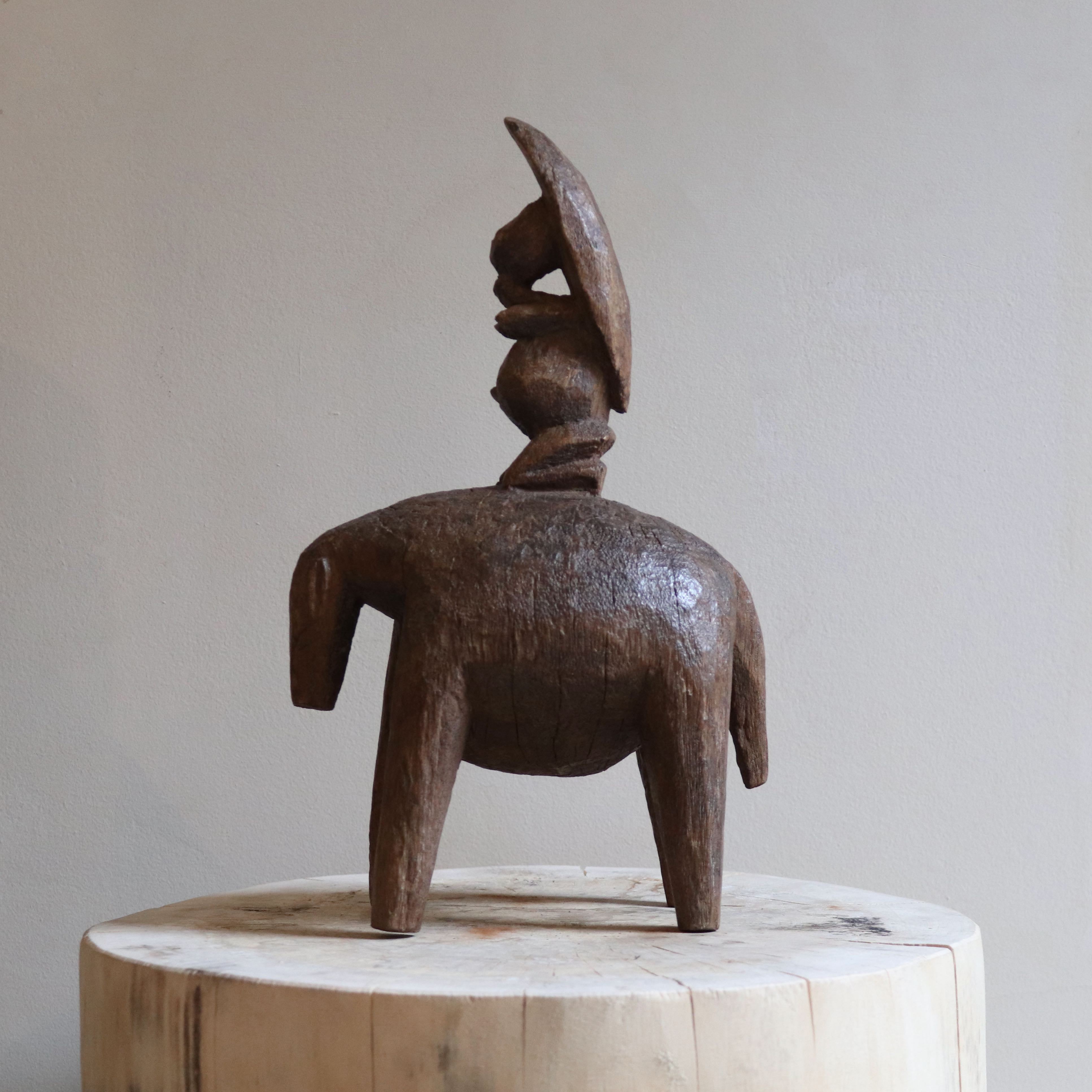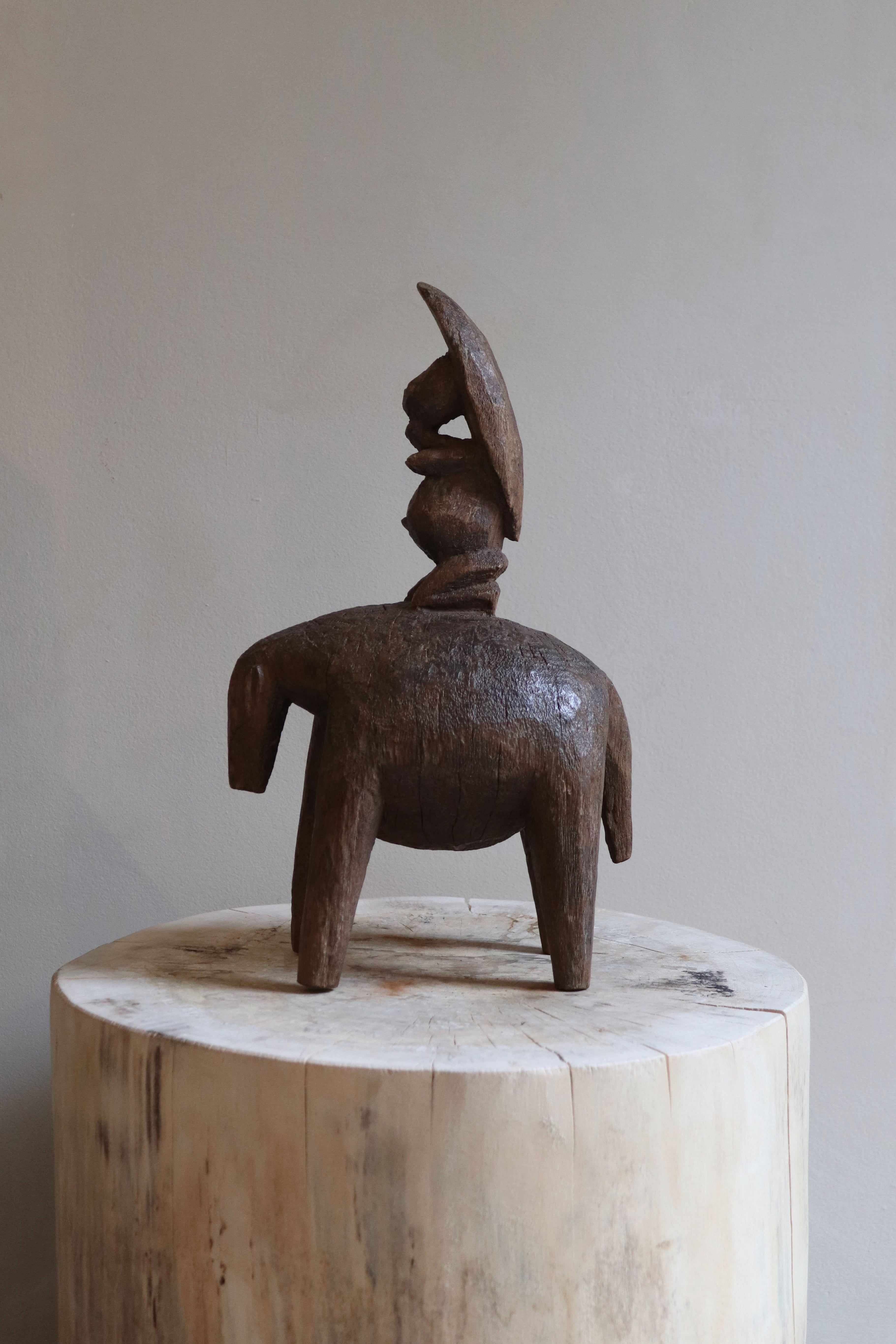 Carved wood sculpture depicting a Dogon horseman, a symbol of power and wealth in Dogon culture. The stylised form and worn patina reflect traditional craftsmanship and age, making this a strong sculptural piece.