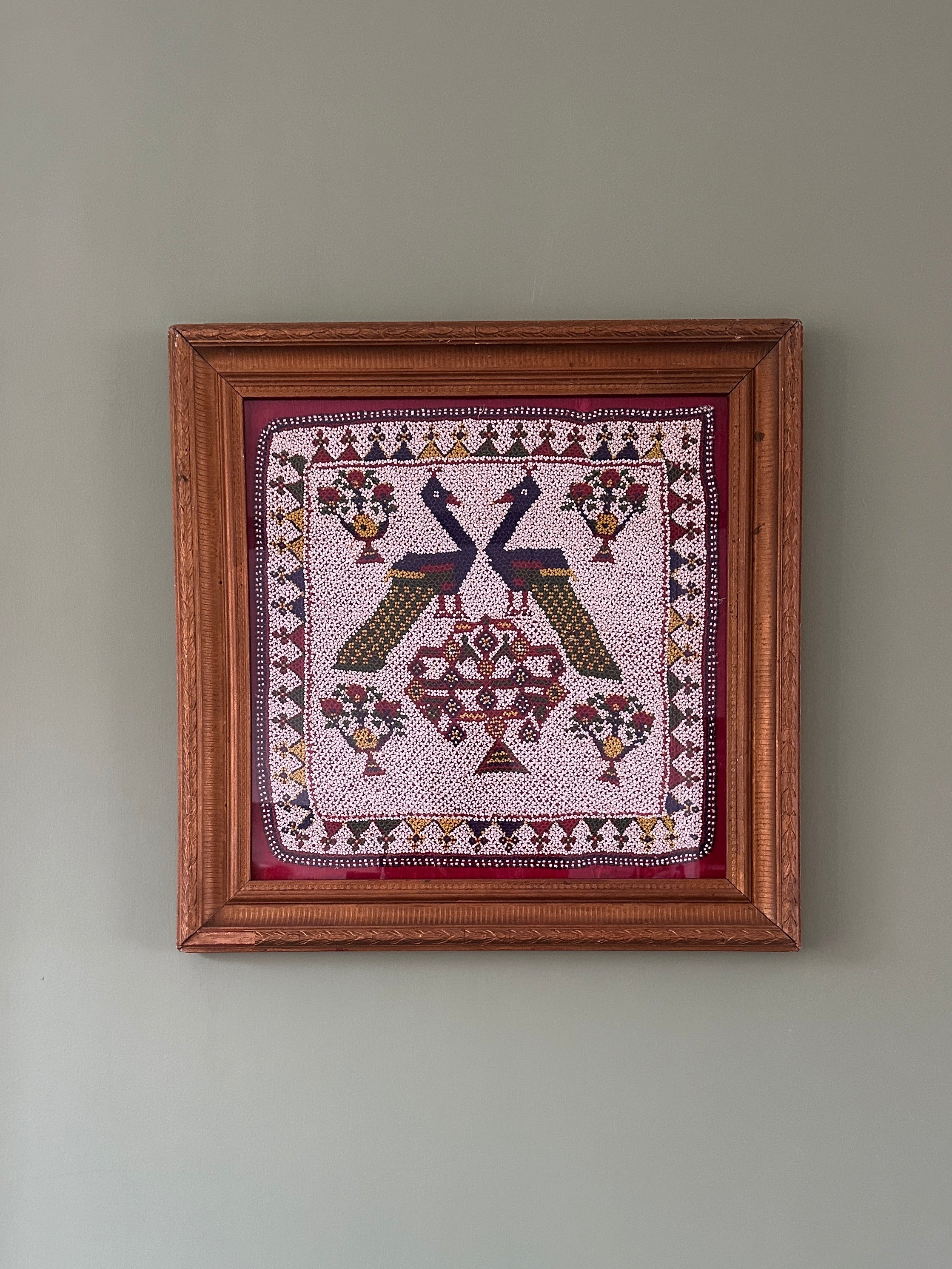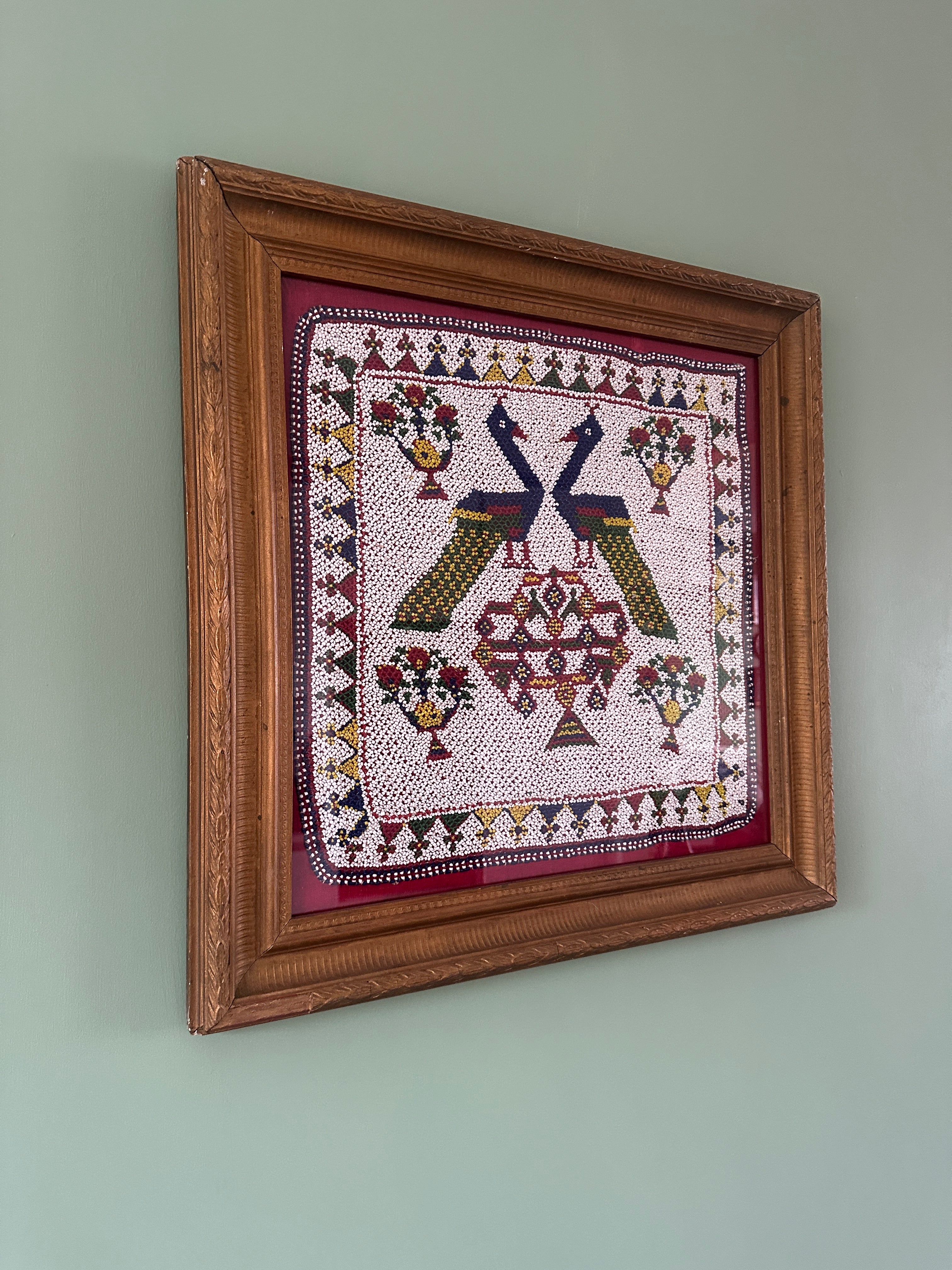 A striking piece of traditional décor featuring intricate Indian beadwork mounted on a red background and displayed in an antique ornate gold-toned frame. The design showcases two stylised peacocks, floral motifs, and geometric borders, all created with detailed multicolored beads.