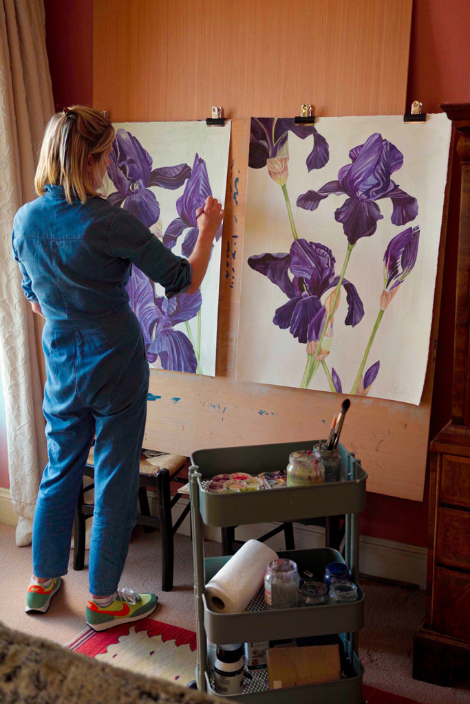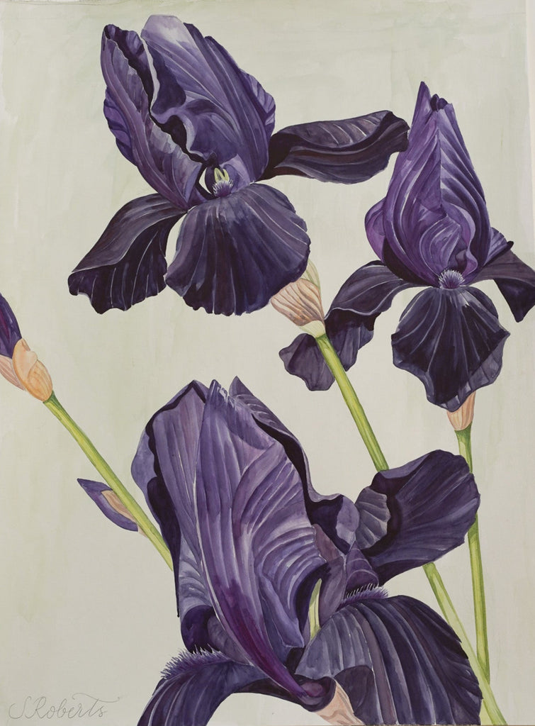 Capturing a selection of Irises together as they grow in the garden on multiple plants and stems. Sophie incorporates the different stages of the flowers life, from blud to full magnificent bloom. With a playful interaction between the stems almost like dancers. These Irises are in the most traditionally recognised colour of deep purple with indigo and almost black hues.