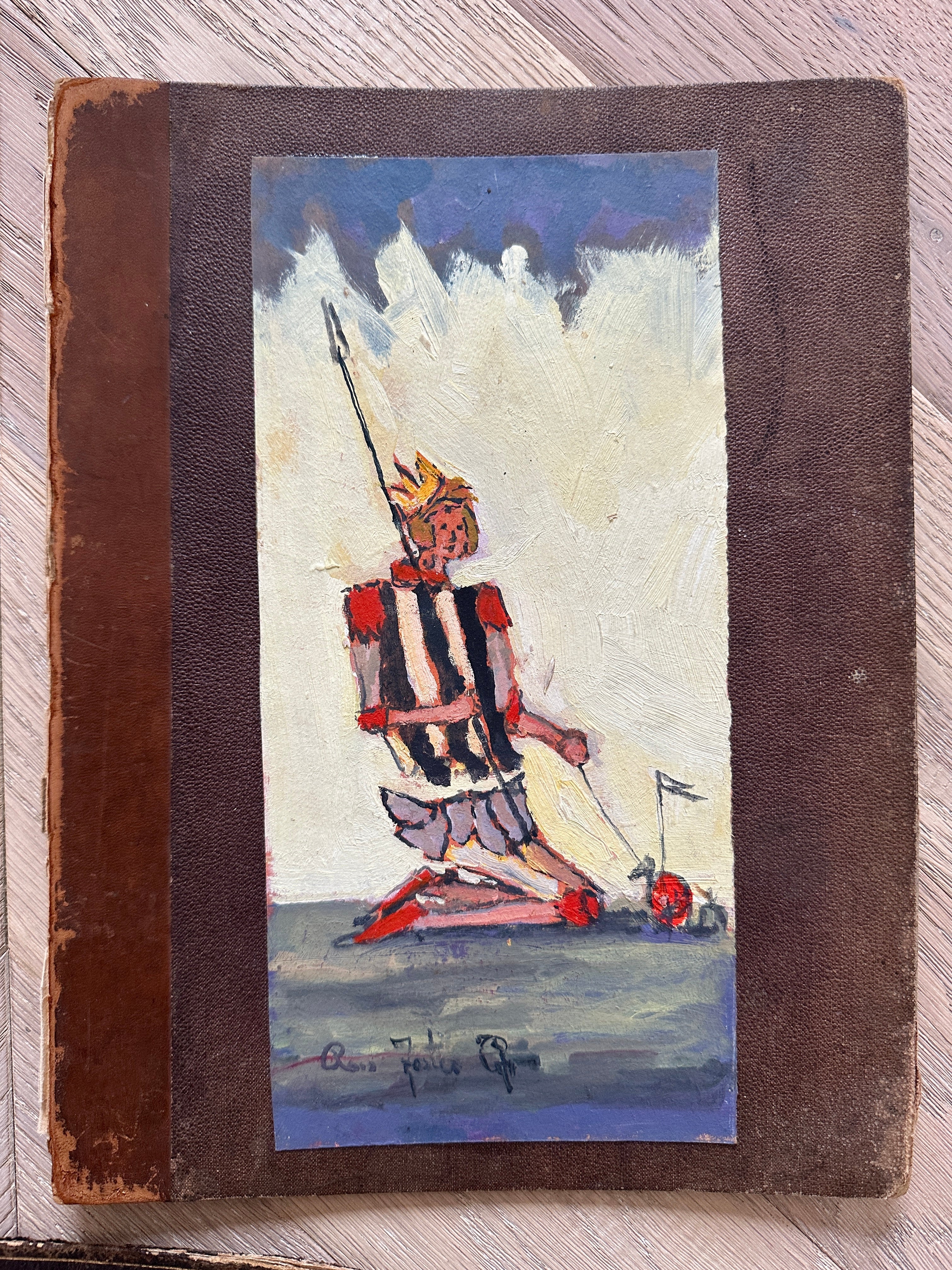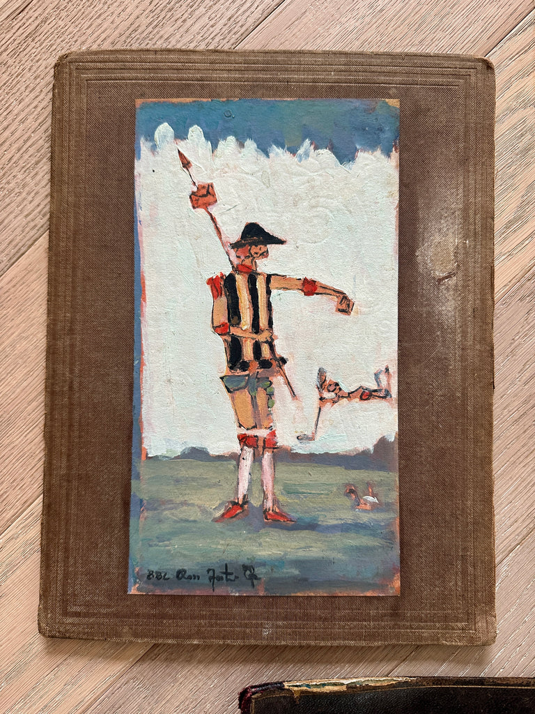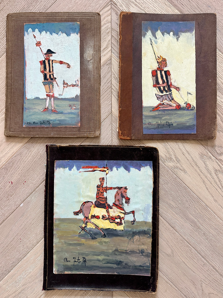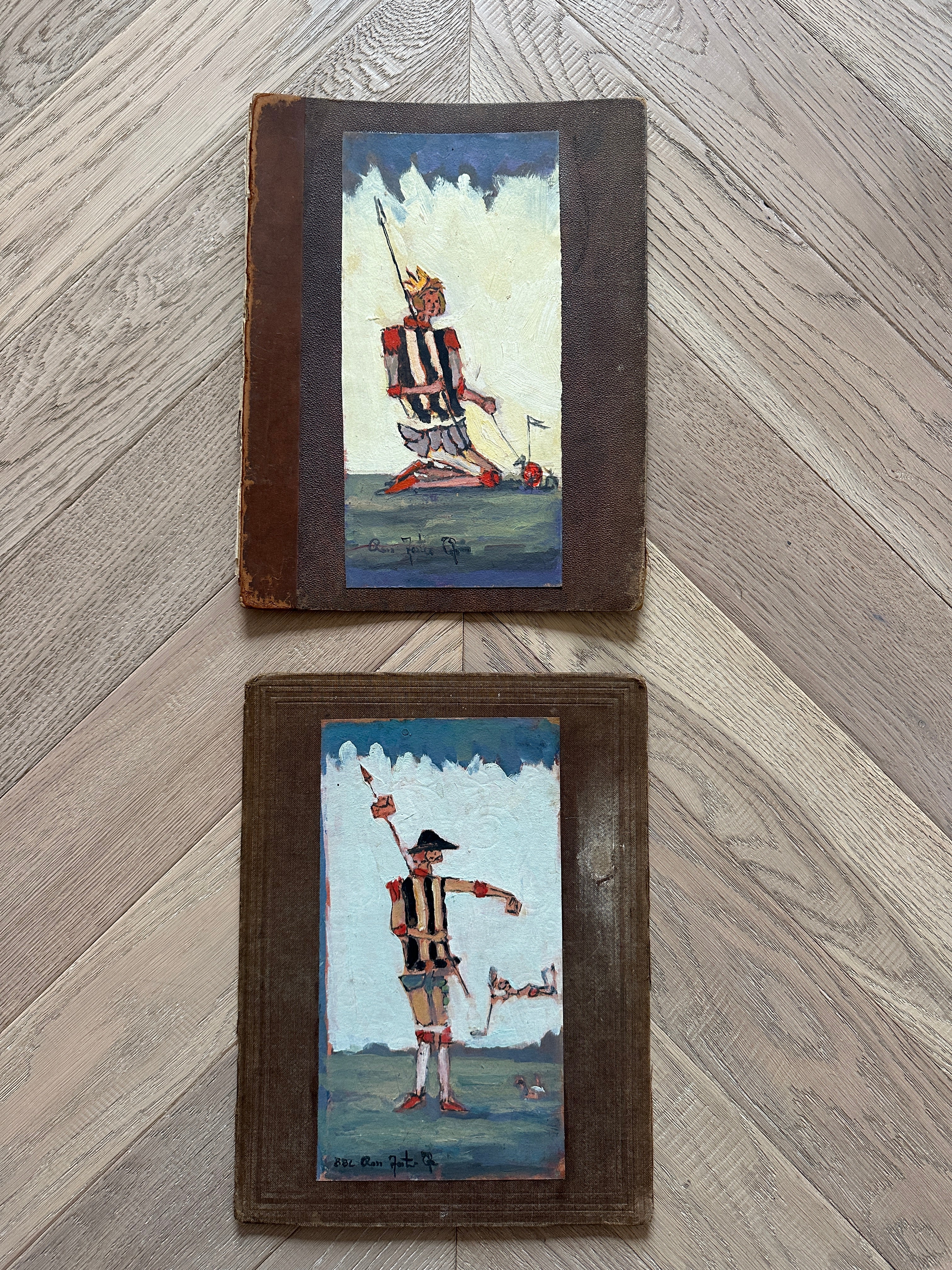Rendered in Foster’s expressive, painterly style, these figures blend whimsy with a hint of satire — each soldier holding a lance and set against loosely brushed pastel backgrounds suggesting both stage and sky. The unconventional use of old book covers as canvases adds a delightful textural depth and a sense of creative spontaneity.