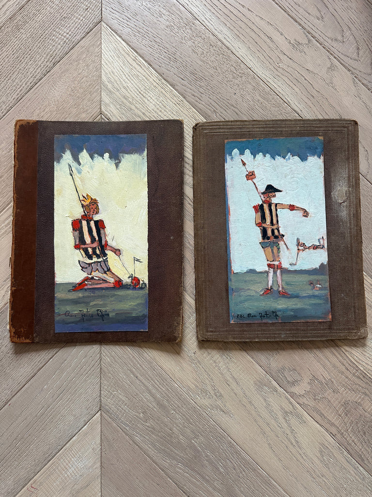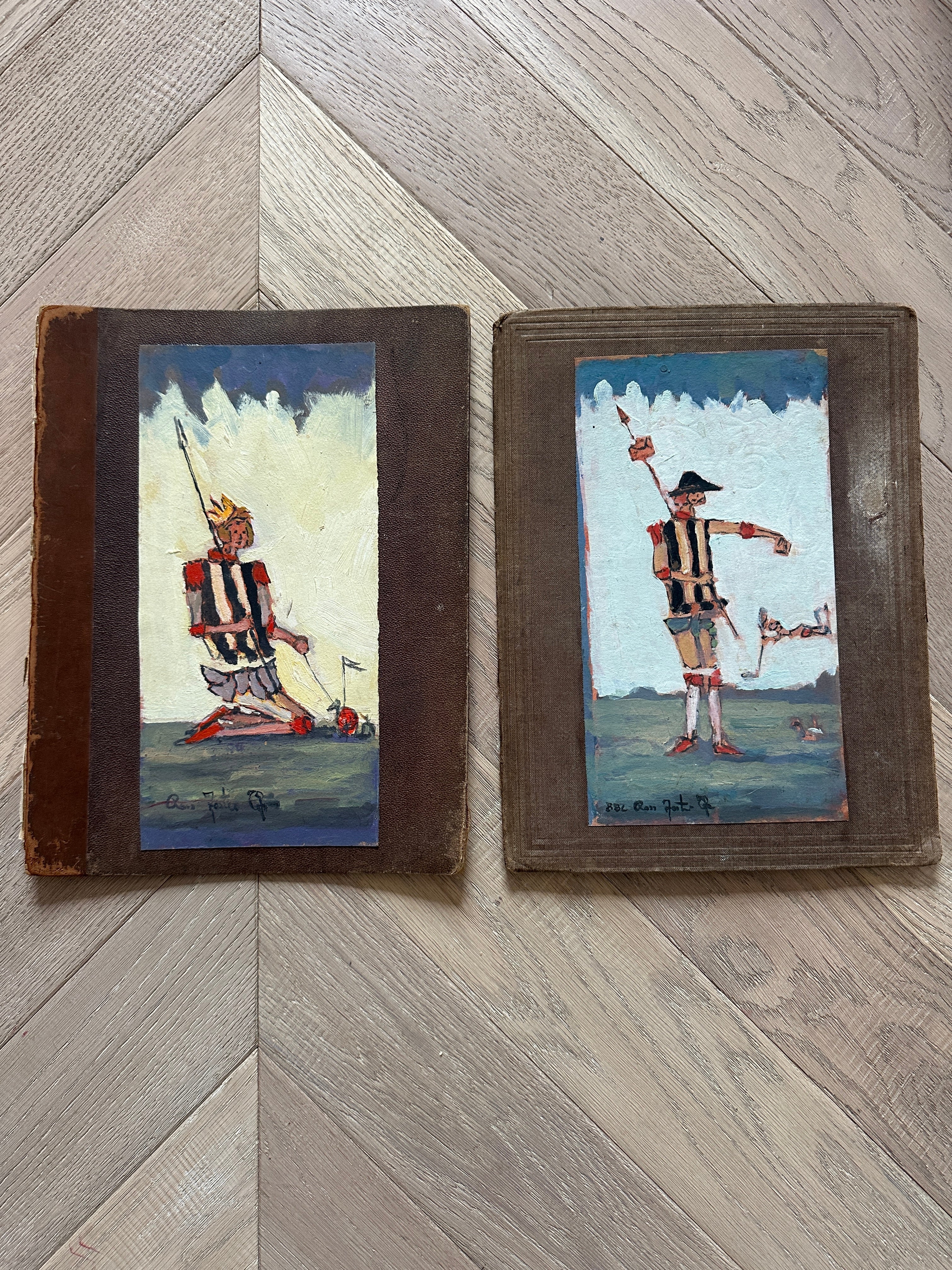 A charming and humorous pair of original oil sketches by British artist Ross Foster, painted directly onto the covers of vintage books. Each piece features a stylised, almost cartoon-like soldier in a bold black-and-white striped uniform, accented with lively red details and playful posture.